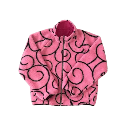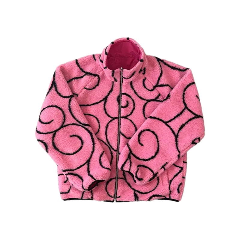 DOFFY is a reversible sherpa jacket with patterns and motifs from a show about a stretchy pirate who wants to be King of the pirates. Featuring a Flamingo pink sherpa fleece exterior made for a king, and a nylon interior with a DOFFY graphic showing what we should aim to do in life: SMILE.